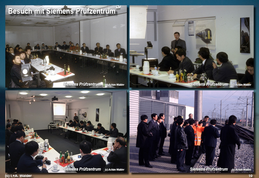Aufgrund internationaler Kontakte weilten hochrangige Delegationen des Verkehrsministeriums der VR China unter Leitung von Herrn Yang und Achim Walder vom Büro für integrierte Verkehrplanung und Stadtentwicklung in Deutschland. Herr Walder hatte für die Gäste ein informatives und wegen der zeitlichen Enge dicht gedrängtes Programm zusammengestellt. Großes Interesse zeigten die Besucher aus Bahnfirmen und aus den verschiedenen Verkehrsministerien der chinesischen Provinzen an Bahntechnik allgemein und Firmen mit Bahntechnik in Deutschland. Aus diesem Grund wurde das Büro für intergierte Verkehrsplanung und Stadtentwicklung mit seinen internationalen Kontakten über Chinesische Außenhandelsbüros angefragt, Reisen zu bahntechnischen Zielen auszuwählen und für die Dauer des Aufenthaltes zu betreuen. Verschiedene Ziele in Nordrhein-Westfalen, Rheinland-Pfalz und Hessen waren dafür geeignet. Diese Dokumentation zeigt einige Beispiele. Dazu gehören Bahnstrecken, die reaktiviert wurden oder in regionale Trägerschaft überführt wurden und so vor der Stilllegeung bewahrt wurden. Weitere Ziele waren Firmen, wie die Firma Brendebach in Siegen, die Infrastruktur wie Bahnhöfe, Haltepunkte und Betriebswerke plant und baut. Ein gern besuchtes Ziel war das neue Siemens Prüfzentrum in Wegberg-Wildenrath. Hier wurden den Besuchern auch neue ICE-Züge, S-Bahnen und U-Bahnen vorgestellt. Alle Besucher nahmen mit ihren Fotoapparate sehr viele Fotos auf. Zum Abschluss jedes Abends gab es ein ausgiebiges chinesisches Essen. /iw